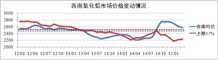 西南市場方面,在經(jīng)歷半年的價(jià)格上浮之后,目前全國氧化鋁市場價(jià)格出現(xiàn)了整體回落趨勢,其中西南價(jià)格回落趨勢較為明顯。2015年1-3月,西南氧化鋁均價(jià)分別為2687元/噸、2611元/噸和2576元/噸,月化環(huán)比回落為2%左右。從價(jià)格變動(dòng)趨勢上看,預(yù)計(jì)今年第二季度西南氧化鋁市場價(jià)格將下探至2520元/噸的平均水平線,低于全國現(xiàn)貨均價(jià),但整體價(jià)格波動(dòng)水平保持相對穩(wěn)定。
