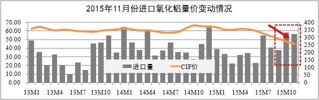 進(jìn)口市場(chǎng)方面:統(tǒng)計(jì)期內(nèi),進(jìn)口氧化鋁市場(chǎng)價(jià)格波動(dòng)趨勢(shì)基與國(guó)內(nèi)市場(chǎng)基本一致。進(jìn)口量方面,10月全國(guó)進(jìn)口氧化鋁58萬(wàn)噸,11月進(jìn)口56萬(wàn)噸,較去年同期增長(zhǎng)27%,環(huán)比有所回落;價(jià)格方面,11月CIF均價(jià)319美元,折合人民幣2040元/噸,環(huán)比下降5.1%。進(jìn)口價(jià)格持續(xù)下跌折射出國(guó)際有色市場(chǎng)的悲觀氣氛仍在持續(xù),而內(nèi)外價(jià)差將會(huì)轉(zhuǎn)化進(jìn)口需求為國(guó)產(chǎn)需求。