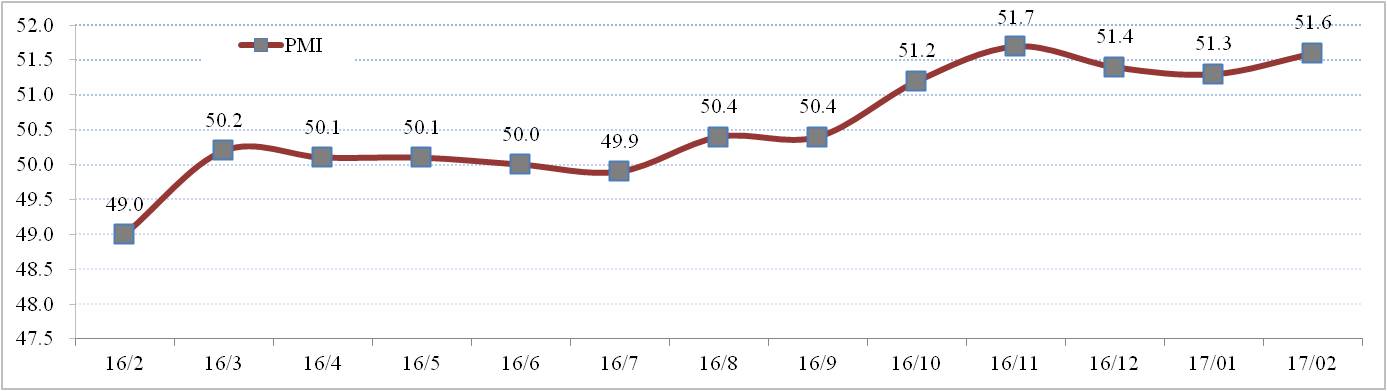 國(guó)家統(tǒng)計(jì)局?jǐn)?shù)據(jù)顯示,2017年2月份制造業(yè)PMI為51.6%,比上個(gè)月上升0.3個(gè)百分點(diǎn)。其中,五大分項(xiàng)指數(shù)全部上升,生產(chǎn)、新訂單、供應(yīng)商配送時(shí)間指數(shù)分別為53.7%、 53%、50.5%,分別比上個(gè)月上升了0.6、0.2、0.7個(gè)百分點(diǎn)。雖然原材料庫(kù)存和從業(yè)人員指數(shù)仍然低于榮枯線,分別為48.6%、49.7%,但比上個(gè)月上升了0.6個(gè)和0.5個(gè)百分點(diǎn)。