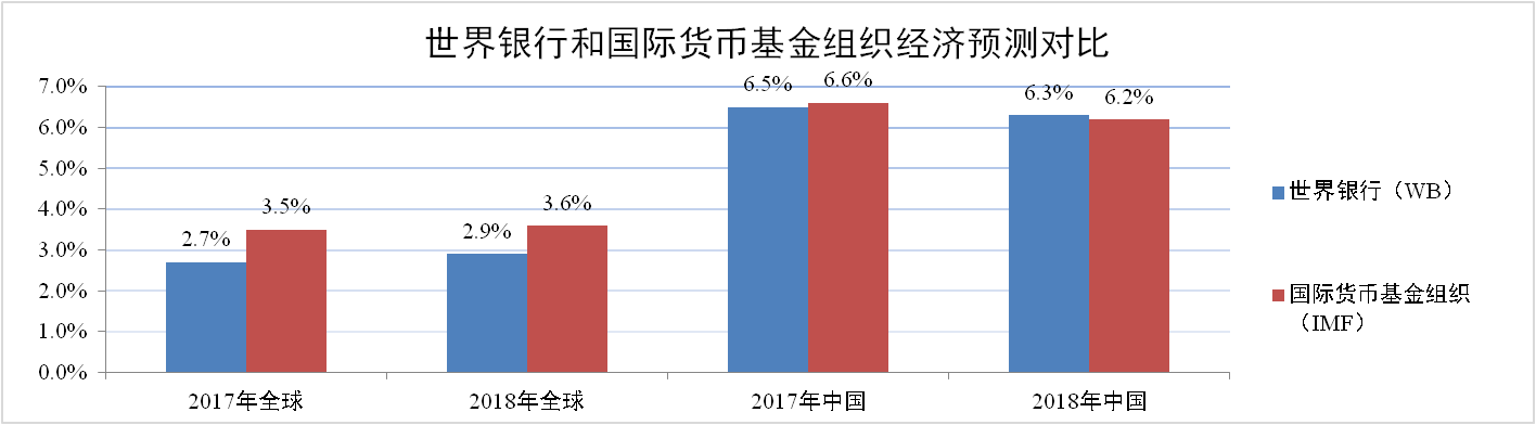 世界銀行2017年6月《全球經(jīng)濟展望》數(shù)據(jù)顯示,隨著制造業(yè)和貿(mào)易回暖以及大宗商品價格趨穩(wěn),預(yù)計2017年和2018年全球經(jīng)濟增速分別為2.7%和2.9%;發(fā)達經(jīng)濟體經(jīng)濟增速分別為1.9%和1.8%;新興市場和發(fā)展中經(jīng)濟體經(jīng)濟增速分別為4.1%和4.5%;中國經(jīng)濟增速分別為6.5%和6.3%。