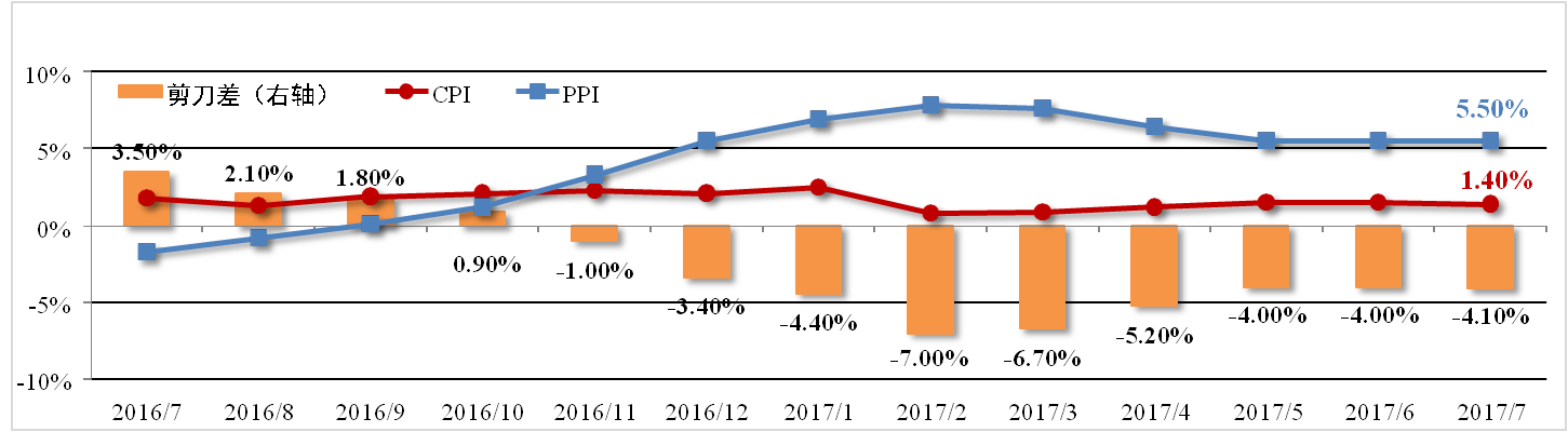 7月份全國居民消費價格指數(shù)(CPI)為1.4%,較上月縮小0.1個百分點,主 要原因在于水果大量上市致使鮮果價格下降以及豬肉價格疲軟。生產價格指數(shù)(PPI)為5.5%,連續(xù)三個月持平。剪刀差較上月擴大0.1個百分點至-4.1%。