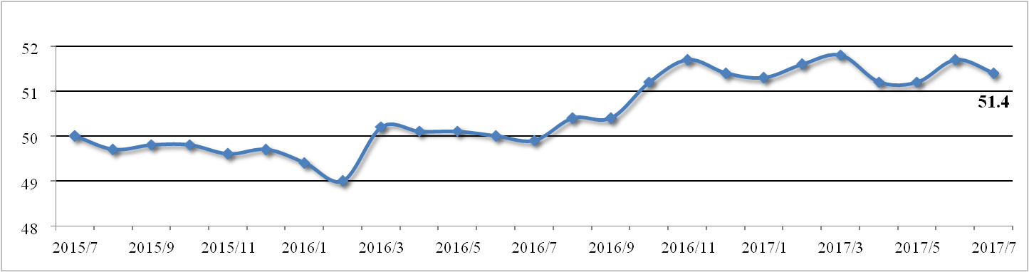7月官方制造業(yè)PMI為51.4%,略低于預期,較上月回落0.3個百分點,依然 位于景氣區(qū)間。生產指數(shù)與新訂單指數(shù)差值大幅縮小至0.7個百分點,反映制造 業(yè)供求關系有所改善,對商品價格形成支撐。