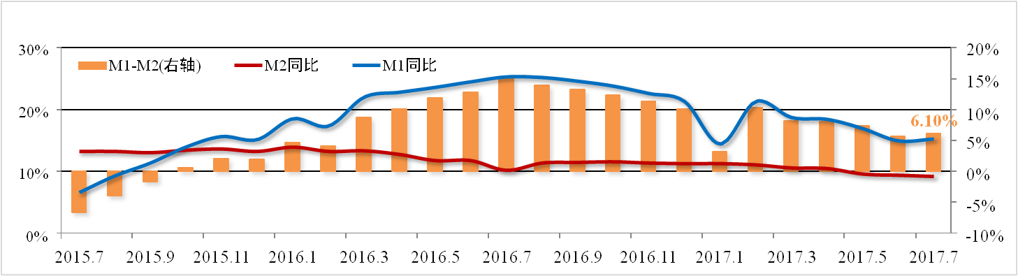 7月份M2增速為9.2%,較上月下滑0.2個百分點,再創(chuàng)歷史新低。M1與M2 差額為6.1%,較上月擴大0.5個百分點。社會融資規(guī)模累計168.01萬億元,其中 實體經(jīng)濟融資規(guī)模114.31萬億元,同比增長13.5%,較上月擴大0.4個百分點。