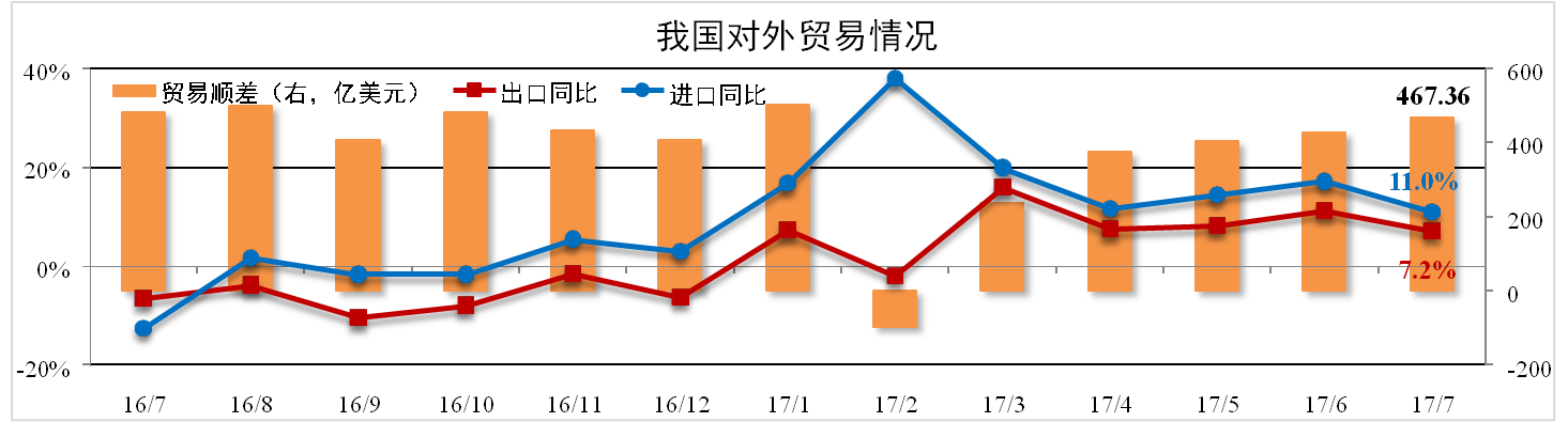 據(jù)海關總署數(shù)據(jù),7月份我國進出口總值3405.55億美元,同比增長8.8%。 其中出口1936.46億美元,同比增長7.2%;進口1469.09億美元,同比增長11.0%; 貿易順差為467.36億美元,環(huán)比上漲9.3%。