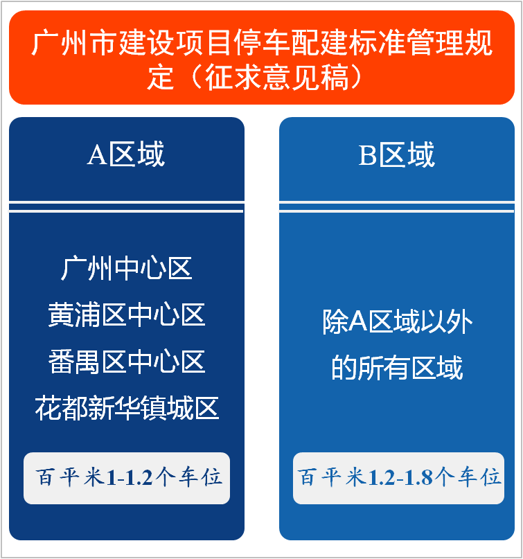 11月17日,廣州市政府發(fā)布《廣州市建設(shè)項(xiàng)目停車配建標(biāo)準(zhǔn)管理規(guī)定(征求意見(jiàn)稿)》。規(guī)定新建、改建、擴(kuò)建的住宅類建設(shè)項(xiàng)目及大于500平方米的公共建筑類、工業(yè)建筑類建設(shè)項(xiàng)目,按A、B兩區(qū)域進(jìn)行劃分規(guī)定。