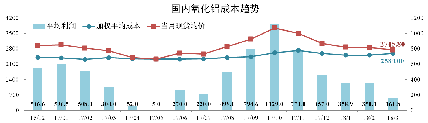 分析認(rèn)為:3月份煤炭價(jià)格持續(xù)下滑,但燒堿持續(xù)沖高疊加山西礦石整頓導(dǎo)致的礦石預(yù)期緊張,推升3月份氧化鋁成本線上移。鋁錠庫存下滑帶動(dòng)鋁價(jià)上漲,氧化鋁需求上漲將帶動(dòng)拉動(dòng)價(jià)格,預(yù)計(jì)氧化鋁利潤空間有所擴(kuò)大。
