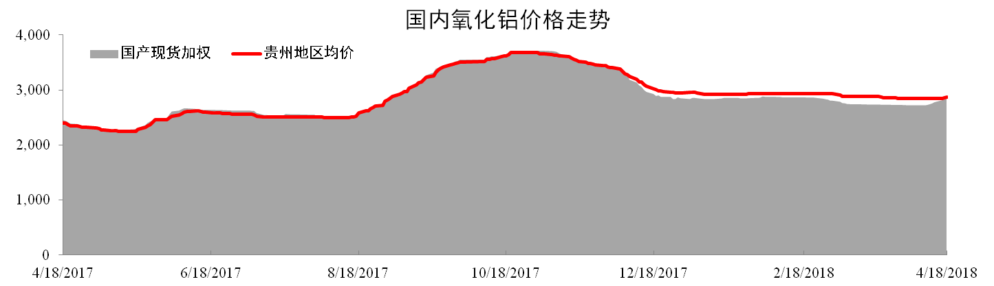 截至4月18日,國產(chǎn)氧化鋁現(xiàn)貨加權(quán)均價(jià)為2895元/噸,同比上漲18.03%,環(huán)比上漲5.82%。貴州地區(qū)氧化鋁現(xiàn)貨加權(quán)均價(jià)為2,867元/噸,同比上升19.36%,環(huán)比下跌0.46%。