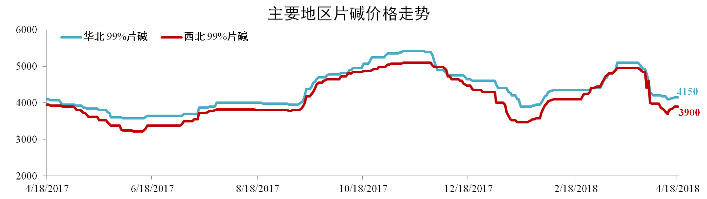 3月受市場(chǎng)供需基本面主導(dǎo),片堿價(jià)格沖高后回落。截止2018年4月18日,華北99%片堿價(jià)格報(bào)4150元/噸,環(huán)比下跌18.63%,西北99%片堿價(jià)格報(bào)3900元/噸,環(huán)比下跌21.21%。