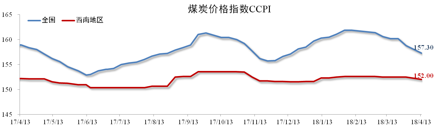 3月份我國(guó)煤炭?jī)r(jià)格呈現(xiàn)連續(xù)回調(diào)的趨勢(shì)。截至4月13日,全國(guó)煤炭?jī)r(jià)格指數(shù)報(bào)157.3點(diǎn),同比下降1.01%,環(huán)比下降2.05%。西南地區(qū)煤炭?jī)r(jià)格指數(shù)報(bào)152點(diǎn),同比下降0.13%,環(huán)比下降0.33%。