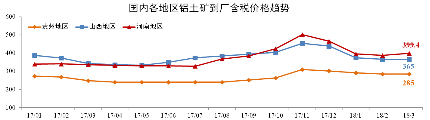 3月份各地鋁土礦價(jià)格保持穩(wěn)定。截止2018年3月,貴州(AL:60%,A/S:5.5-6)到廠(chǎng)含稅價(jià)月均價(jià)285元/噸,環(huán)比無(wú)變動(dòng);山西鋁土礦365元/噸,環(huán)比無(wú)變動(dòng);河南鋁土礦399.4元/噸,環(huán)比上漲3.07%。