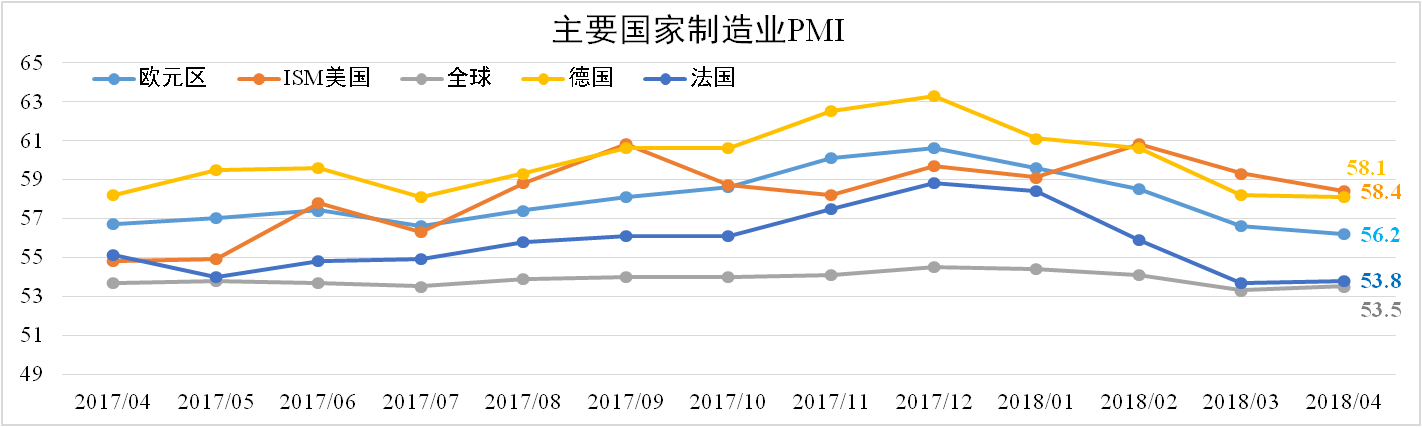 全球經(jīng)濟(jì)景氣度有所回升。據(jù)IHS與摩根數(shù)據(jù)顯示,4月份全球制造業(yè)PMI為53.5,較上月擴(kuò)大0.2個(gè)百分點(diǎn)。其中,4月份ISM美國(guó)制造業(yè)PMI為57.3,較上月大幅收縮0.9個(gè)百分點(diǎn),德國(guó)下滑0.1個(gè)百分點(diǎn)至58.1,整體平穩(wěn)。