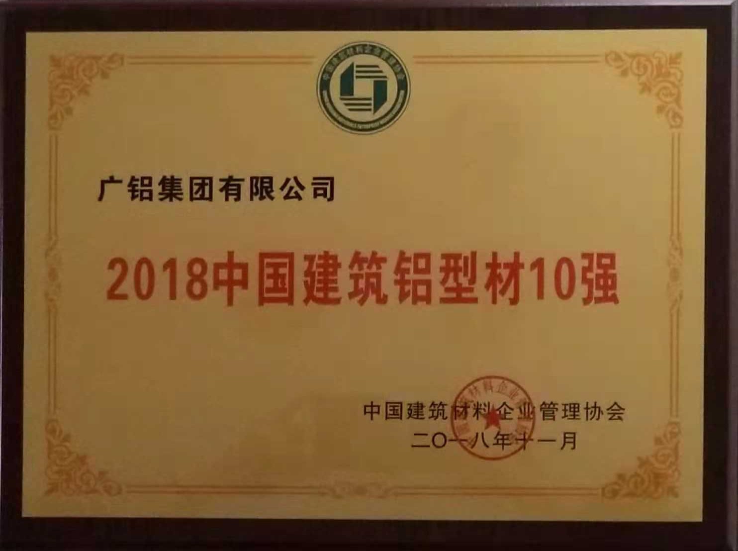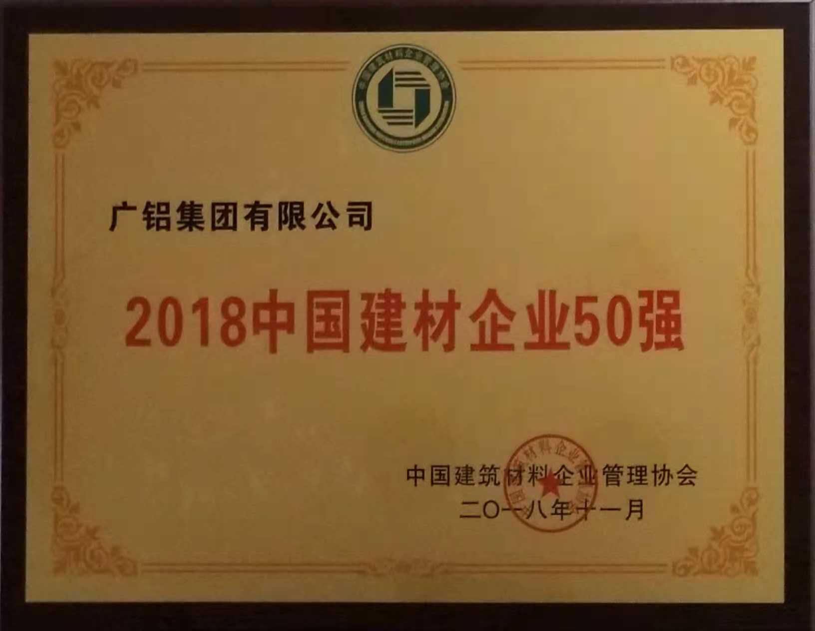 廣鋁榮獲“2018中國建材企業(yè)50強(qiáng)”、“2018中國民營建材企業(yè)20強(qiáng)”、“2018中國建筑鋁型材10強(qiáng)”稱號