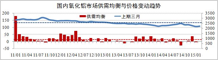 發(fā)稿時(shí)間:2015-04-09市場(chǎng)供給方面,2015年1-2月,全國(guó)氧化鋁市場(chǎng)供給分別為486萬噸和445萬噸,其中進(jìn)口氧化鋁合計(jì)70萬噸,出現(xiàn)了較大幅度回落。近幾年數(shù)據(jù)顯示,進(jìn)口氧化鋁對(duì)國(guó)內(nèi)氧化鋁市場(chǎng)供給的貢獻(xiàn)率基本穩(wěn)定在9%左右,預(yù)計(jì)該貢獻(xiàn)率將下降至7%左右??傮w而言,國(guó)內(nèi)氧化鋁市場(chǎng)供需整體處于理論均衡狀態(tài),但上海期貨交易所三月長(zhǎng)單價(jià)與2570元/噸的均價(jià)出現(xiàn)了較大程度的偏離。