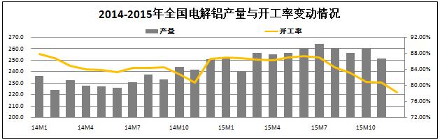 市場供給情況。產(chǎn)能方面,11月全國電解鋁建成產(chǎn)能約為3860萬噸,運(yùn)行產(chǎn)能為3020萬噸,開工率為78.2%;產(chǎn)量方面,11月電解鋁產(chǎn)量251萬噸,同比增長3.9%,累計(jì)同比增長9.9%,其中:山東、新疆、內(nèi)蒙、河南四省份全國產(chǎn)量占比63%。截至12月18日,全國電解鋁合計(jì)減產(chǎn)444.5萬噸,占國內(nèi)總產(chǎn)能的11.5%,其影響效果將于2016年第二季度得到體現(xiàn)。