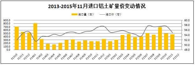 海關(guān)數(shù)據(jù)顯示,11月我國進(jìn)口鋁土礦460萬噸,環(huán)比下降了6.12%,降幅較上期收窄了21.8個(gè)百分點(diǎn)。價(jià)格方面,報(bào)告期內(nèi)進(jìn)口均價(jià)較上月普遍下降2-3美元的幅度,11月進(jìn)口均價(jià)為55美元。從數(shù)據(jù)分布上看,影響11月進(jìn)口鋁土礦量下滑的主要原因是大部分氧化鋁企業(yè)虧損,部分廠家開始減產(chǎn),同時(shí)進(jìn)口礦石價(jià)格下跌的觀望氣氛逐步增強(qiáng)。