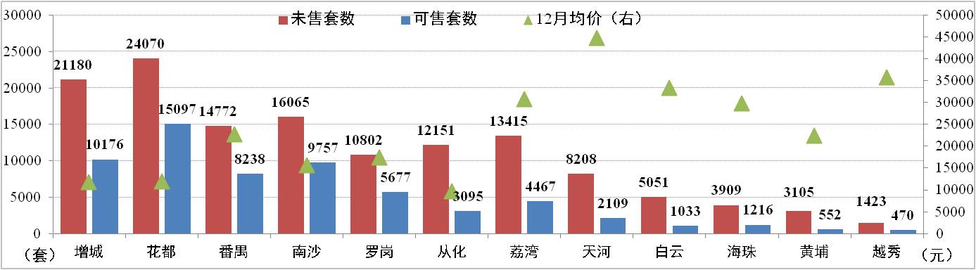 12月份廣州市新建住宅商品房共196,038套,環(huán)比增加3.6%。其中可售和未售房源分別為61,887套和134,151套,其中花都、增城、南沙以及番禺四區(qū),合計(jì)占比分別為69.9%和56.7%;而增城占比分別為16.4%和15.8%,均出現(xiàn)小幅下降。
