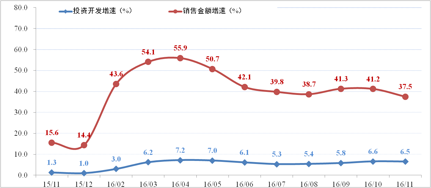 開發(fā)投資方面:2016年1-12月份,全國房地產(chǎn)開發(fā)投資同比增長6.9%,增速環(huán)比增加0.4百分點(diǎn)。其中,住宅投資增長6.4%,增速環(huán)比提高0.4個百分點(diǎn)。住宅投資占房地產(chǎn)開發(fā)投資的比重為67.0%。