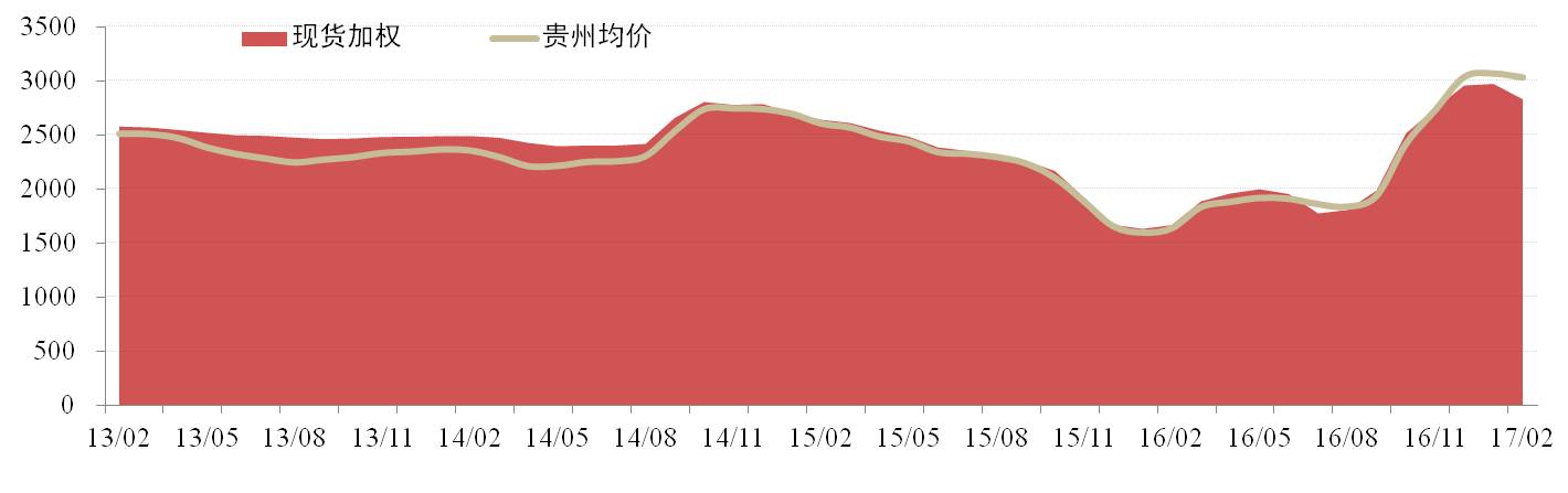 全國現(xiàn)貨價格方面,2月份成為氧化鋁價格走勢的分水嶺,氧化鋁市場價格出現(xiàn)小幅下降但主要氧化鋁企業(yè)控制力仍在,價格相對可控。全國氧化鋁現(xiàn)貨加權(quán)價為2,928元/噸,環(huán)比下降1.38%。貴州氧化鋁現(xiàn)貨加權(quán)價為3,030元/噸,環(huán)比下降1.17%。貴州地區(qū)現(xiàn)貨加權(quán)價格相對高于全國其他地區(qū)。