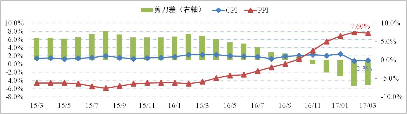 一季度國內經(jīng)濟呈現(xiàn)投資回升、貿易趨勢性向好,PMI、CPI、PPI等主要經(jīng)濟指標數(shù)據(jù)均呈現(xiàn)向好局面,因此預計一季度GDP增長6.8%。但國內經(jīng)濟仍然呈現(xiàn)出工業(yè)生產(chǎn)穩(wěn)以及消費數(shù)據(jù)弱的格局,主要表現(xiàn)在價格層面上PPI與CPI的剪刀差仍高,3月份CPI同比上漲0.9%連續(xù)兩個月同比增長低于1%;PPI同比上漲7.6%,環(huán)比回落0.2個百分點漲幅依然處于高位。國內經(jīng)濟增長面臨的風險主要來自金融和房地產(chǎn)風險兩個方面;其中,主要包括債務違約和債務處置負擔沉重、房地產(chǎn)投資和民間投資增速下滑、去杠桿、去產(chǎn)能和隱性失業(yè)問題等風險。