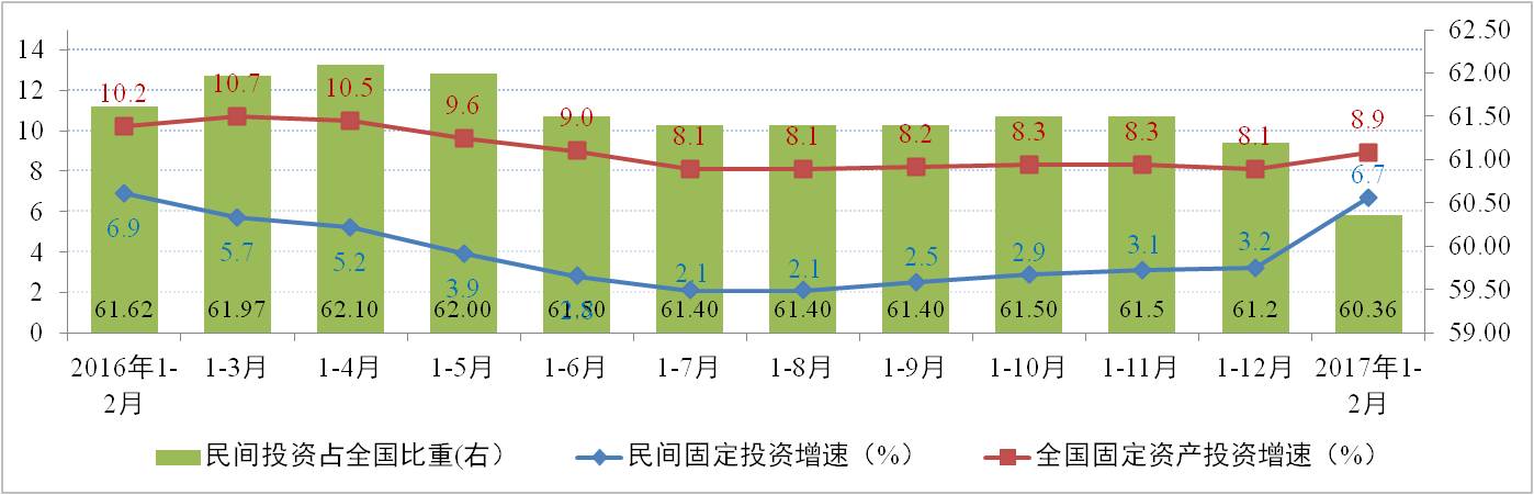 據(jù)國家統(tǒng)計局統(tǒng)計數(shù)據(jù)顯示,2017年1-2月全國固定資產(chǎn)投資完成額度為4.14萬億元,同比增長8.9%,增速比去年全年提高0.8個百分點。其中,民間固定資產(chǎn)投資額為2.98萬億元,同比增速為6.7%,增速創(chuàng)11個月新高;較去年全年提高3.5個百分點,連續(xù)第7個月增速環(huán)比提升。