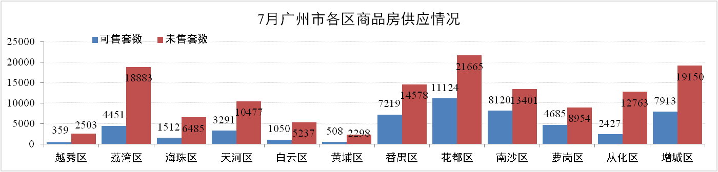 7月31日,廣州市新建住宅商品房共189,053套。其中:可售住宅商品房為52,695套,占比27.85%;未售住宅商品房136,394套,占比72.15%?;ǘ?、增城、番禺、荔灣庫(kù)存量較高,可售和未售房源累計(jì)占全市比例分別為58.31%和54.46% 。
