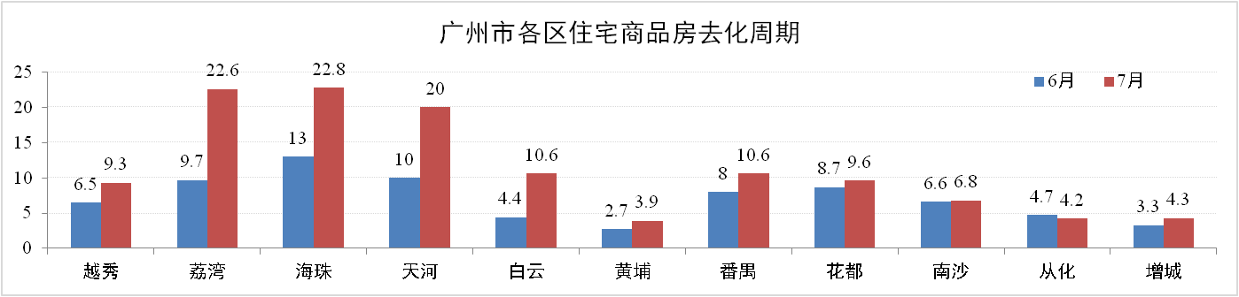 截至7月底,由于近期成交量回落,廣州住宅地產(chǎn)去化周期上升至7.2個(gè)月,總體庫(kù)存量為643.54萬(wàn)㎡。其中,海珠、荔灣、天河三區(qū)去化周期明顯上升,荔灣區(qū)為22.8個(gè)月,居于全市首位。而黃埔、增城等區(qū)因價(jià)格相對(duì)較低,剛需較強(qiáng),去化周期僅剩4個(gè)月左右。