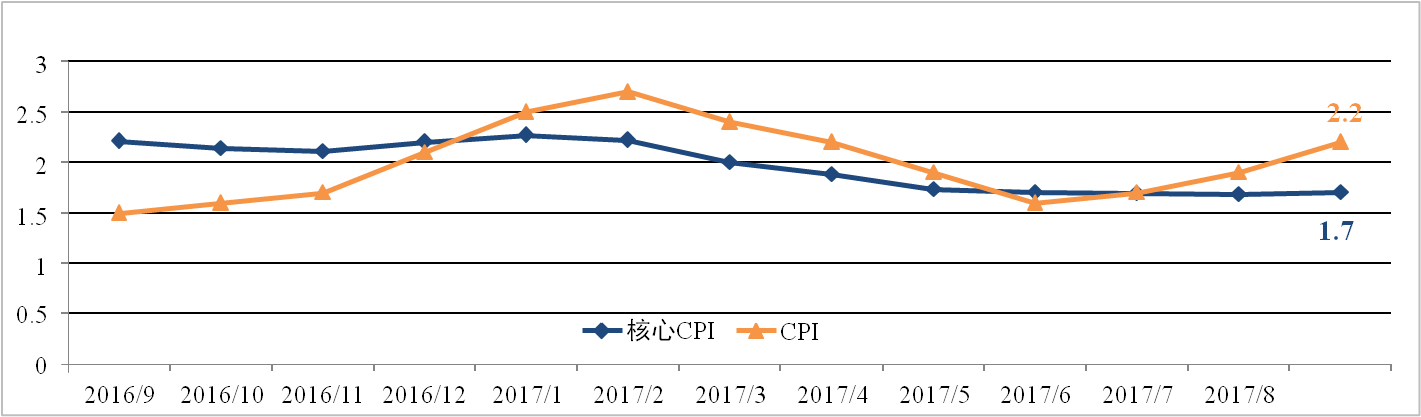 美國9月物價(jià)指數(shù)增速回升,但略低于市場預(yù)期。9月美國CPI為2.2%,較 上月擴(kuò)大0.3個(gè)百分點(diǎn),核心CPI為1.7%,與上月基本持平。颶風(fēng)襲擊美國產(chǎn) 油區(qū)造成能源產(chǎn)能下降推高原油價(jià)格是CPI上漲的主要原因。