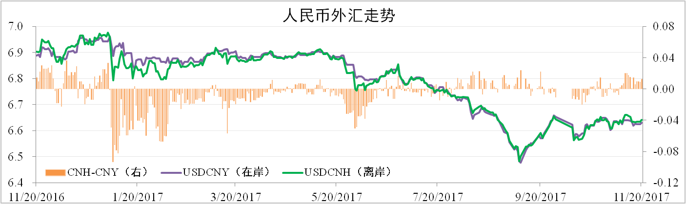 近期人民幣匯率整體維持震蕩走勢,一方面特朗普訪華達成匯率協(xié)調的共識,另一方面市場對中美兩國經濟前景表現(xiàn)樂觀。截至11月20日,在岸人民幣報6.6299,環(huán)比微跌0.17%,離岸人民幣報6.6425,環(huán)比跌0.33%。