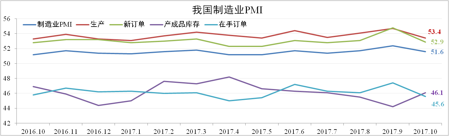 10月份我國官方制造業(yè)PMI為51.6,較上月回落0.8,達到年內均值。從分項看,生產、新訂單與在手訂單紛紛下降,產成品庫存大幅上升,說明下游需求不足,制造業(yè)活動較上月放緩。
