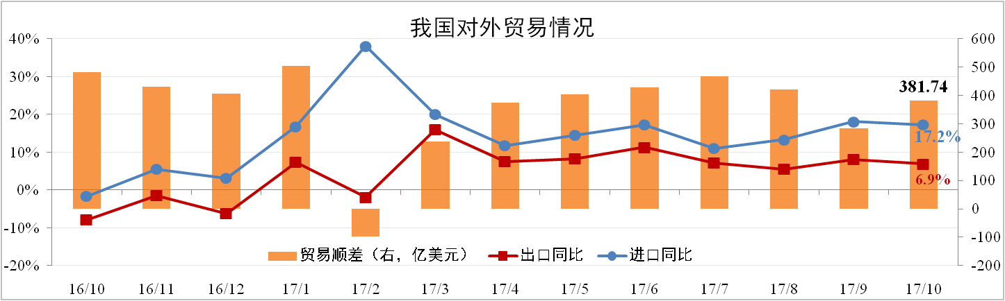 分析認為:美、歐PMI均處于高點,因此10月進出口放緩與十一長假和人民幣升值有關。由于國內冬季限產內需不足,同時高基數(shù)與CPI上漲使企業(yè)出口承壓,預計11月進出口繼續(xù)回落。