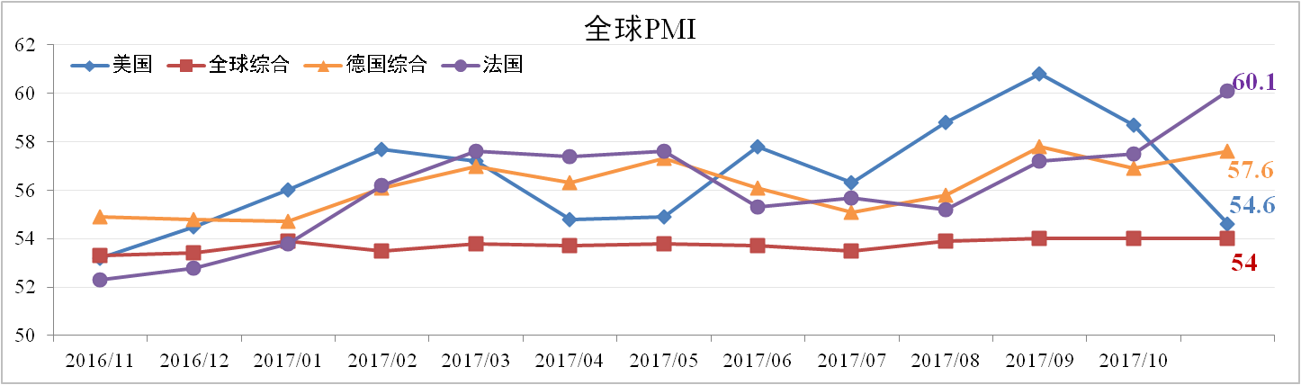 據(jù)市場調查機構IHS Markit數(shù)據(jù)顯示,11月全球綜合PMI為54,持平于上月。發(fā)達國家表現(xiàn)有所分化,其中美國綜合PMI下滑至54.6,德國、法國綜合PMI則分別上揚至57.6、60.1。