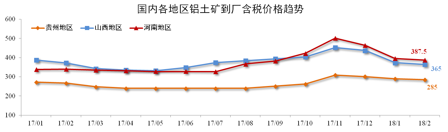2月份各地鋁土礦價格保持下調(diào)。截止2018年2月,貴州(AL:60%,A/S:5.5-6)到廠含稅價月均價285元/噸,環(huán)比下降2.06%;山西鋁土礦365元/噸,環(huán)比下降2.38%;河南鋁土礦387.5元/噸,環(huán)比下降2.07%。