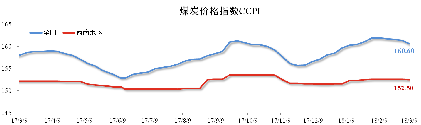 2月份我國煤炭價格呈現(xiàn)理性回落的趨勢。截至3月9日,全國煤炭價格指數(shù)報160.6點,同比上升1.58%,環(huán)比下降0.8%。西南地區(qū)煤炭價格指數(shù)報152.5點,同比上升0.2%,環(huán)比下跌0.07%。
