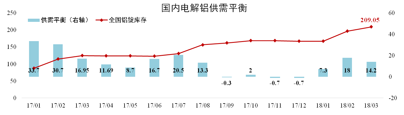發(fā)稿時(shí)間:2018-04-27據(jù)阿拉丁數(shù)據(jù),3月份我國電解鋁產(chǎn)量302萬噸,同比下跌2.89%,環(huán)比上升9.14%。凈進(jìn)口0.2萬噸,總供應(yīng)量302.2萬噸,總消費(fèi)量288萬噸,當(dāng)月理論供應(yīng)過剩14.2萬噸。3月底全國鋁錠庫存209.05萬噸,環(huán)比上漲6.22%。