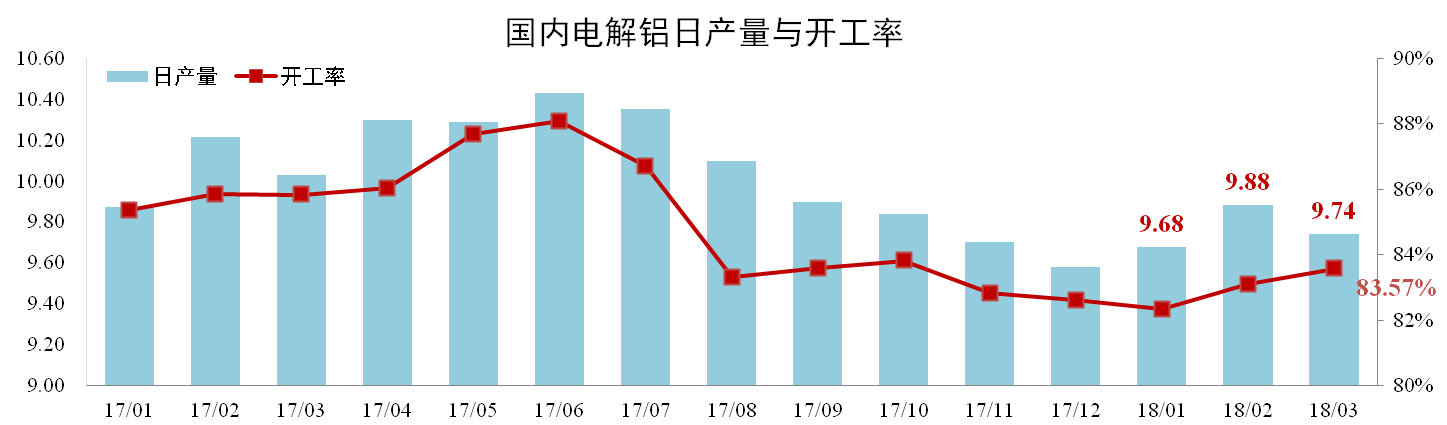 分析認(rèn)為:基于復(fù)產(chǎn)和新投產(chǎn)需要周期,3月份產(chǎn)能沒有出現(xiàn)顯著增長,部分電解鋁企業(yè)檢修致使日產(chǎn)量有所下調(diào)。二季度隨著天氣轉(zhuǎn)暖、需求復(fù)蘇合規(guī)產(chǎn)能將加速投產(chǎn)復(fù)產(chǎn),預(yù)計(jì)后期日產(chǎn)量及開工率將有所上升。