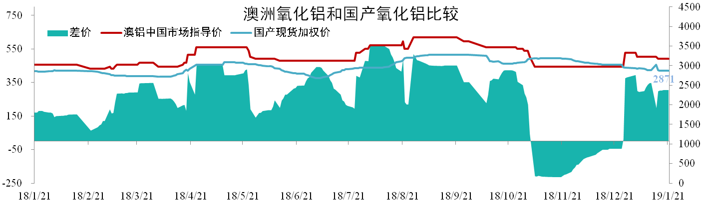 截至1月21日,國產(chǎn)氧化鋁現(xiàn)貨加權(quán)均價為2871元/噸,環(huán)比下降4.92%。澳鋁中國市場指導(dǎo)價為3175元/噸,同比上漲4.96%,國產(chǎn)氧化鋁價格較澳鋁指導(dǎo)價低304元/噸。