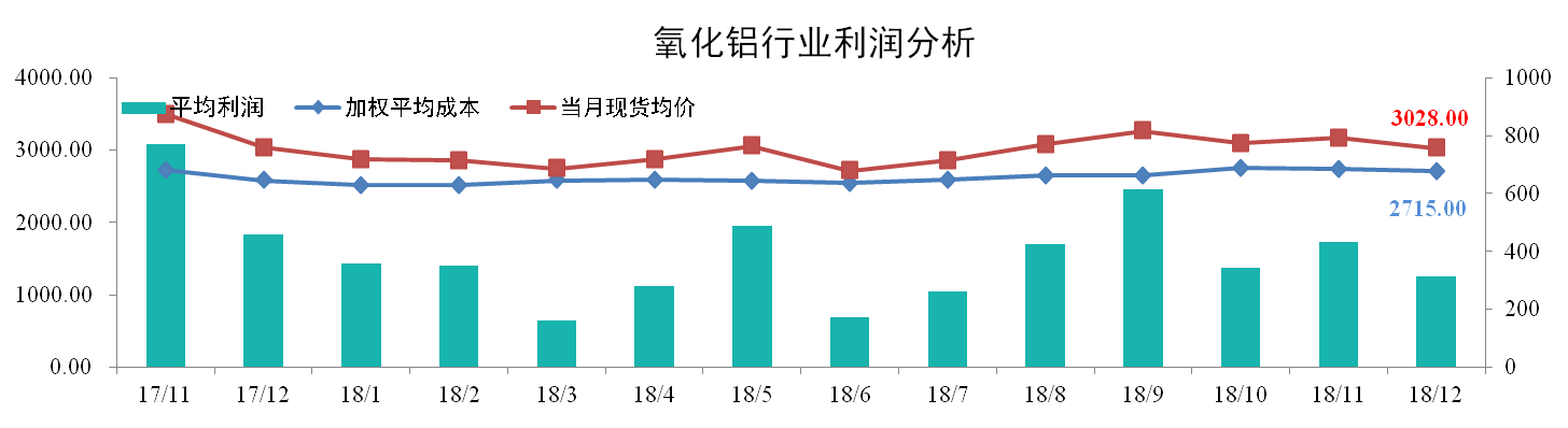 12月份國內(nèi)氧化鋁加權(quán)平均成本為2715元/噸,較上月下降0.80%。當(dāng)月全國氧化鋁現(xiàn)貨成交均價為3028元/噸,較上月下降4.51%。理論氧化鋁行業(yè)平均利潤水平為313元/噸。