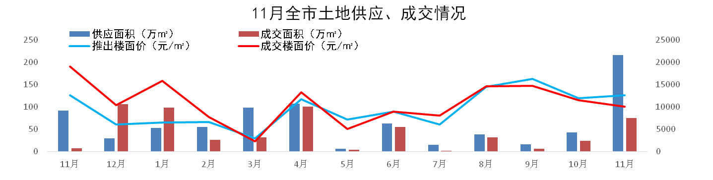 11月廣州市共推出26宗地塊,分別為25塊住宅用地和1塊商業(yè)用地,推出面積216.4萬㎡。商住用地共成交12宗,成交面積74.7萬㎡,成交樓面價(jià)10045元/㎡。