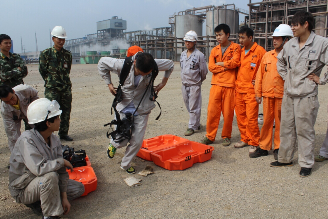 上午10:00時,安全環(huán)保處技術(shù)員何開順、陳紅到溶出現(xiàn)場空地對各車間員工進行消防器和空氣呼吸器的使用方法的培訓指導,說明比賽流程和比賽規(guī)則后組織按照原料、溶出、分解、蒸發(fā)、焙燒、煤氣、熱電、電控、裝備、化驗、行政出場順序開始進行比賽。各參賽隊員均勢若猛虎、爭分奪秒,最終化驗車間李翔以15'44"的成績拿下消防水帶使用比賽第一名,熱電車間蔣勝以15'72"取得消防水帶使用比賽第二名,行政處陳方以16'61"取得消防水帶使用比賽第三名;焙燒車間羅奉彬以14'80"取得空呼器呼吸器比賽第一名,煤氣車間熊津凱以16'88"取得第二名,熱電車間聶明福18'72"取得第三名。