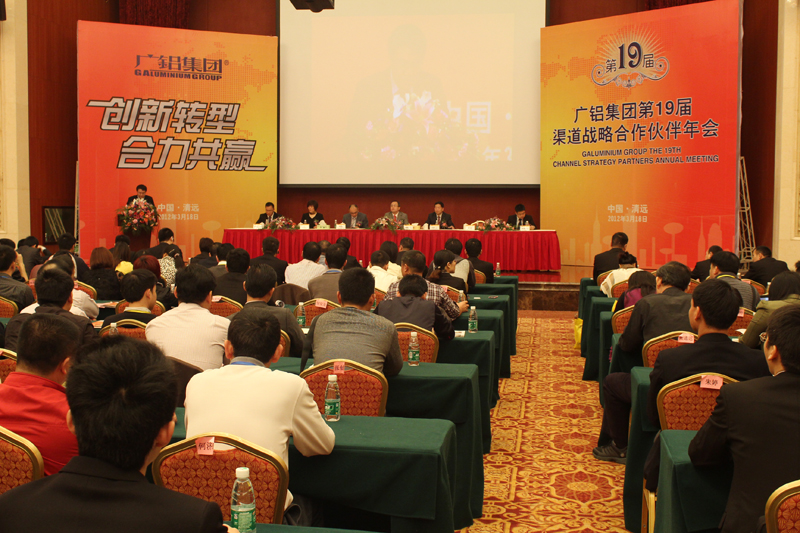 2012年3月18日,廣鋁集團(tuán)于廣東清遠(yuǎn)恒大隆重舉辦了“廣鋁集團(tuán)第十九屆渠道戰(zhàn)略合作伙伴年會(huì)”,此次年會(huì)以“創(chuàng)新轉(zhuǎn)型,合力共贏”為核心,攜手核心伙伴共同探討與分享企業(yè)轉(zhuǎn)型升級(jí)之路及經(jīng)營與管理之道。
